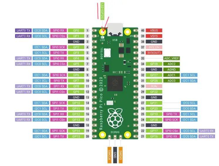 If you need a simple status indicator and don’t want to waste any GPIO pins, you can always use the built-in LED. This component is found on top of the Pico near the mounting button.